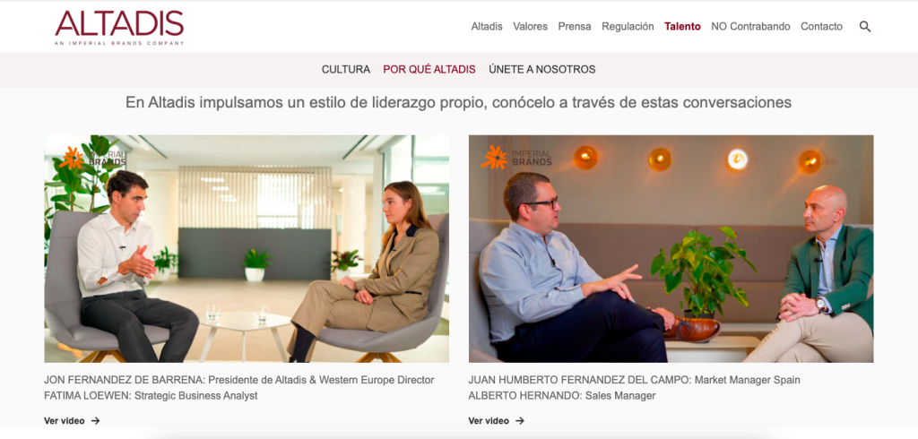 Igualmente, en un apartado audiovisual, se reproducen conversaciones entre directivos y empleados sobre talento, liderazgo o la propia compañía, en las que ha participado el presidente de Altadis, Jon Fernández de Barrena. Al mismo tiempo, según explica la tabaquera, buena parte de las ventajas que supone trabajar en Altadis son transmitidas a través de los propios "embajadores" de la compañía, un grupo de ocho empleados designados entre voluntarios que representan