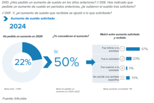 Por otro lado, 1 de cada 5 personas trabajadoras declara haber solicitado un aumento en 2024 (22%). De ellas, tan solo la mitad (50%) lo consiguieron y más de la mitad recibieron una cantidad inferior a la solicitada (57%). Además, de cara al futuro, solo el 20% solicitará un aumento de sueldo, porcentaje que aumenta significativamente respecto a años anteriores, cuando la proporción se situaba en el 16% en 2023 y en el 15% en 2022. Por otra parte, un 80% de los encuestados no pedirá un incremento del salario, de los cuales casi la mitad (el 36%) ya lo han recibido o anticipan recibirlo en breve.