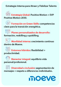 Esta propuesta es resultado de nuestro compromiso con la sostenibilidad, la innovación y el desarrollo integral de las personas que forman parte de nuestra compañía. Desde Moeve, traducimos estos valores en acciones concretas, tales como formación en Green Skills, a través de la adquisición de competencias clave para la transición energética; planes personalizados de desarrollo profesional y beneficios tangibles, o una cultura inclusiva y diversa, promoviendo un entorno de confianza y respeto, alineado con nuestro propósito de transformar la energía y la movilidad. Estas iniciativas refuerzan el sentido de pertenencia interno, pero también proyectan externamente a Moeve como un lugar de trabajo inspirador.