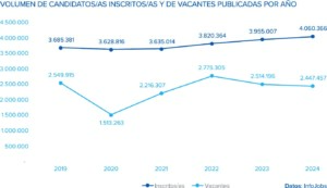En detalle, la oferta de empleo registrada en la plataforma alcanzó las 2.447.457 vacantes, lo que supone un ligero descenso del 3% respecto a 2023, aunque se mantiene en la franja más alta de la serie histórica, en niveles muy similares a 2019. Por su parte, la demanda de empleo sigue en aumento. En 2024, un total de 4.060.366 personas se inscribieron en al menos una vacante, marcando un máximo histórico y un crecimiento del 3% respecto al año anterior.