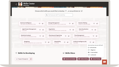 - Skills Center: portal personalizado para que los empleados actualicen sus habilidades, encuentren nuevas funciones y participen en recursos de formación. Al facilitar a los empleados un seguimiento de su progreso, Skill Center ayuda a las empresas a aumentar su compromiso y competencias. Con los datos de Skills Nexus y la información de Skills Advisor ofrece recomendaciones prácticas a los empleados, como la realización de un curso, la reunión con un responsable o entrar a formar parte de otros proyectos. Se puede acceder a Skills Center a través de cualquier dispositivo, así como de Oracle Digital Assistant, Slack y Microsoft Teams.