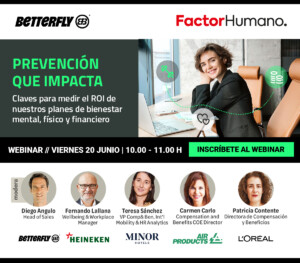 El próximo viernes 20 de junio, de 10:00 a 11:00 horas, Betterfly y Factor Humano celebrarán el webinar "Prevención que impacta: Claves para medir el ROI de nuestros planes de bienestar mental, físico y financiero", una cita clave para profesionales de recursos humanos y líderes organizacionales interesados en potenciar el bienestar corporativo con foco estratégico.